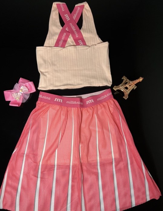Conjunto infantil saia com short por baixo, sobreposição em tule, blusa cropped, tamanho 12.